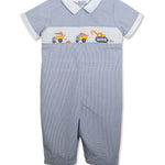 This is a classic baby boy's romper featuring a timeless blue and white gingham pattern. The outfit has short sleeves with white piping on the cuffs and a crisp white Peter Pan collar, adding a refined touch. A hand-smocked panel across the chest showcases embroidered construction vehicles, including dump trucks and an excavator, giving the outfit a fun and playful theme. The romper has a slightly pleated design below the smocking for a comfortable fit, and the legs are finished with a snap closure for easy dressing. This charming and stylish romper is perfect for special occasions, portraits, or everyday wear with a hint of vintage charm.