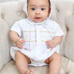 The matching bonnet adds a touch of vintage sophistication, creating a picture-perfect look that’s ideal for baptisms, christenings, or dedication ceremonies. Designed with convenience in mind, the bubble includes easy snap closures for quick changes and a comfortable fit.