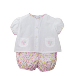Delicate florals and timeless charm come together in this sweet two-piece baby girl set. The crisp white top is adorned with dainty embroidered pockets and trimmed in a soft floral print, perfectly paired with matching bloomers in a pink garden pattern. Designed for comfort and elegance, this ensemble is as practical as it is precious.