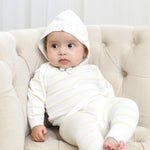 Wrap your little one in cozy charm with this sweet-as-honey two-piece outfit! Featuring soft white knit fabric kissed with cheerful light yellow stripes, it's the perfect blend of comfort and cuteness. Whether it’s playtime, naptime, or photo time, your baby will shine brighter than the morning sun in this cuddly classic. Warning: extreme adorableness ahead!