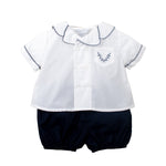Classic and refined, the Navy Crest Baby Set brings timeless charm to your little one’s wardrobe. The crisp white double-breasted shirt is accented with scalloped navy embroidery along the collar, sleeves, and pocket—where a delicate laurel crest adds an elegant touch. Paired with coordinating navy bloomers, this set is perfect for holidays, portraits, or everyday wear with a touch of sophistication.